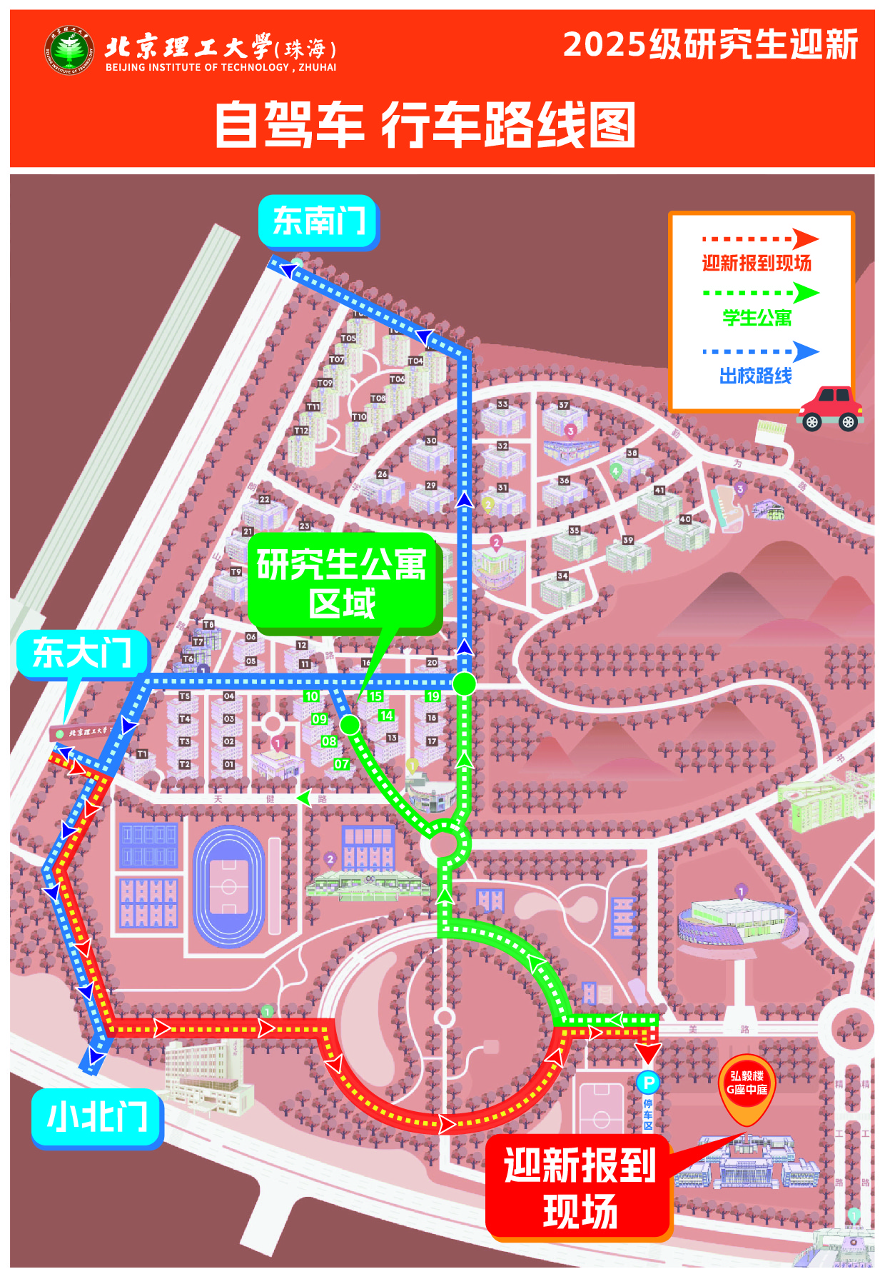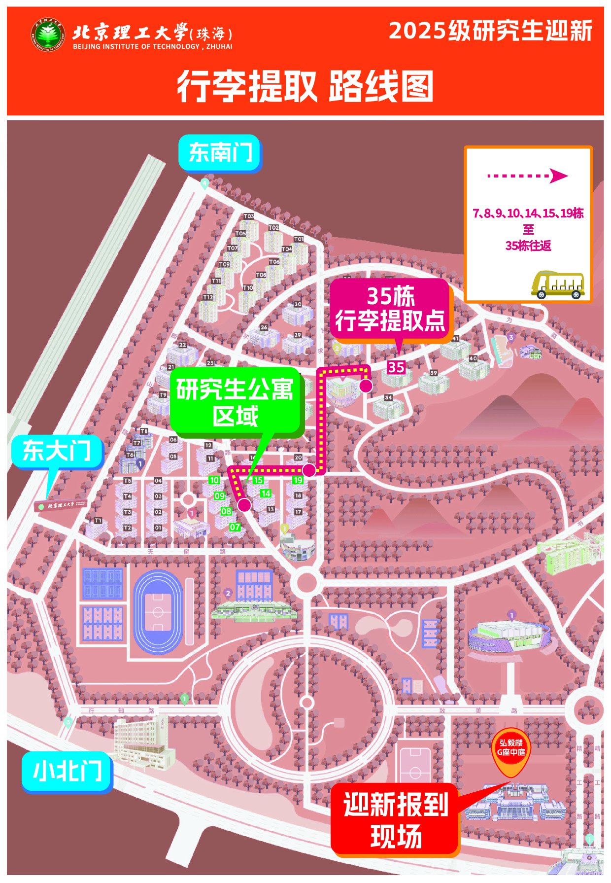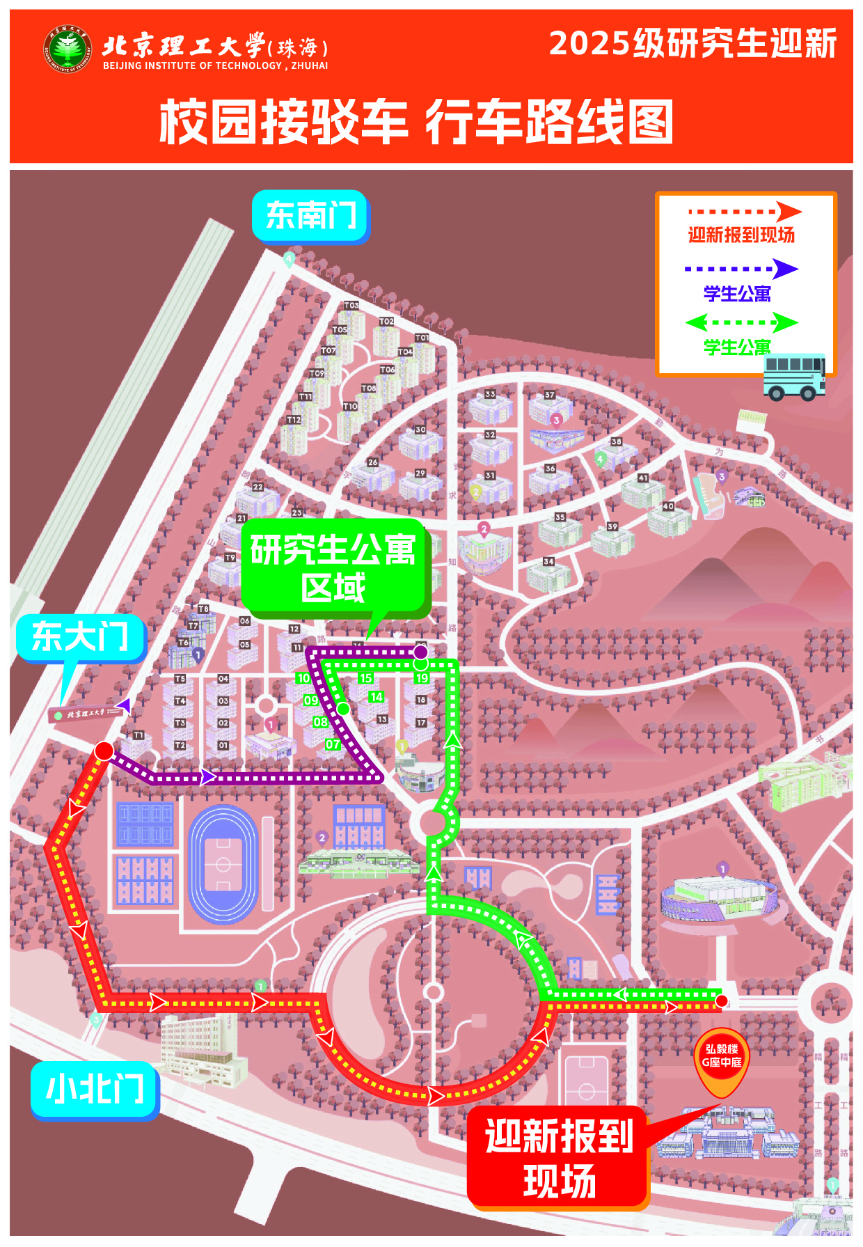 A.在唐家湾站下车的同学,出站后经天桥步行至东大门,统一乘坐校园接驳车抵达迎新现场或宿舍。