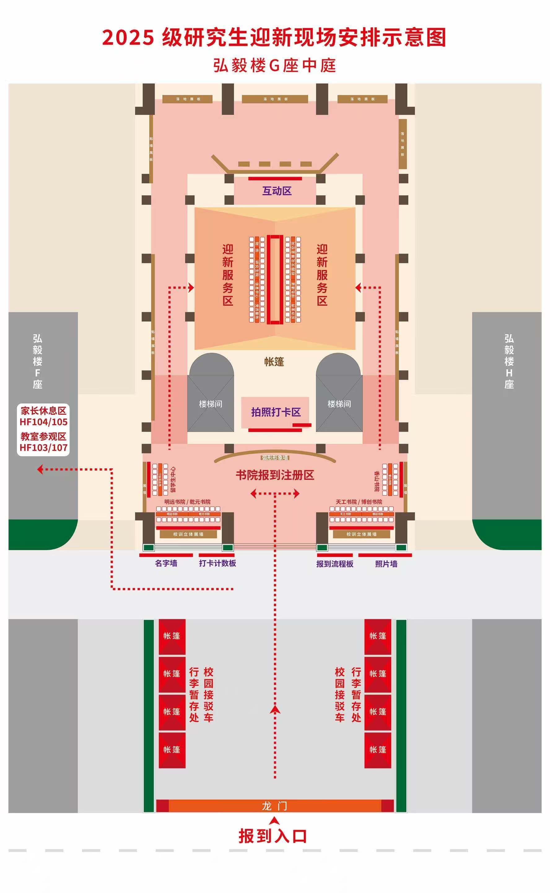 新生入校后,需在弘毅楼迎新现场完成报到流程、在宿舍完成入住流程。可视自身需要选择优先前往弘毅楼书院报到处办理入学资格查验、领取校园一卡通等,或优先前往宿舍办理入住、放置行李。学校在东大门设有迎新接待点、指引牌以及接驳巴士。