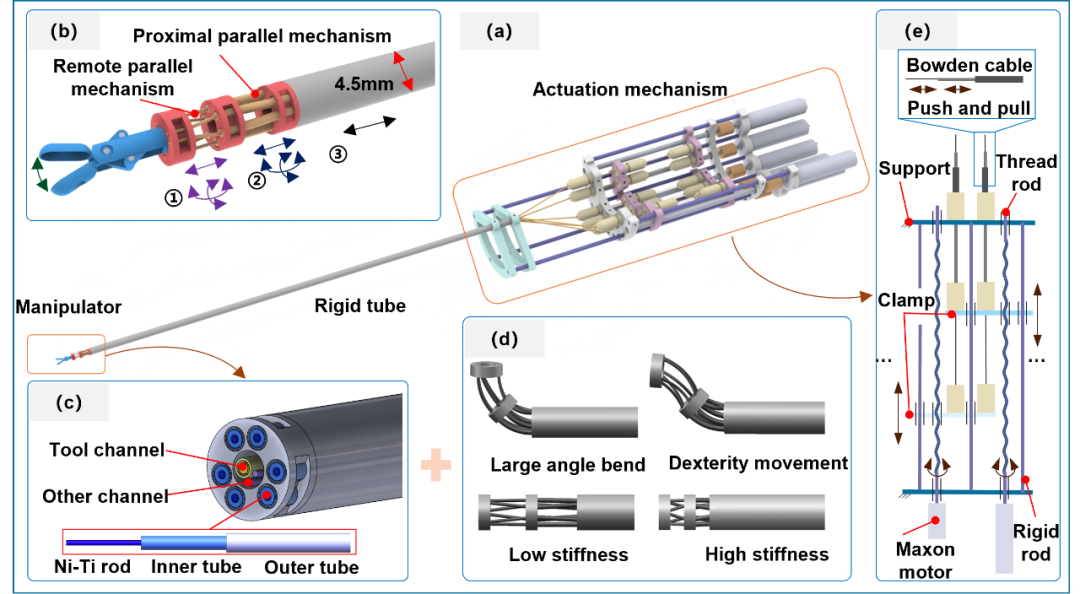 在微创手术领域,器械需穿过狭长通道后,于体内狭小空间内实现灵活、稳定且精准的操作,同时还要在保证执行器小尺寸的前提下,兼顾“柔顺交互”与“刚性操作”的双重手术需求,这是一项持续存在的挑战。本期封面论文题为《Compact Manipulator With Flexible Parallel Mechanisms and Variable Stiffness for Keyhole Procedures》,该研究创新性提出了一款外径仅4.5毫米、具备7个运动自由度和主动刚度调节能力的柔性并联手术执行器,为下一代手术机器人的研发提供了新颖且实用的解决方案。