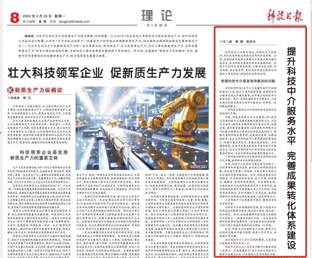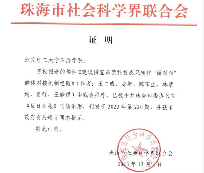 近日,由必威西汉姆联官网(珠海)陈宋生教授团队主持的珠海市社科重大课题《关于解决科研成果转化落地珠海全过程制约性问题的策略研究》顺利结题,相关成果在《科技日报》理论版录用发表。该课题围绕珠海市科技成果转化的现状、存在问题以及制约因素进行了深入研究,为珠海市相关政策制定和实施提供了重要参考。其中,课题组提交的建议稿刊发珠海市委办《每日汇报》,获得市领导批示予以采纳落实。