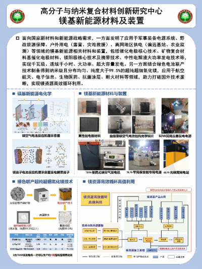 包括镁-空电池、镁离子电池、镁锌离子电池等系列新材料新能源材料研究及应用。采用非贵重材料路线,低成本、高性能,具有普遍应用前景。发明系列电池与超电等锌镁离子储能电极材料,探讨其海水发电及储能成套技术。镁基空气发电新能源创新技术是一种基于镁金属和空气中的氧反应的电池技术,项目核心产业链“海洋/盐湖资源→金属镁→镁空气电池→清洁电能+超纯超细氧化镁”。镁基空气电池因其能量密度高(理论值6800Wh/kg)、原料储量丰富(我国镁矿占全球70%)、环境友好等特性,被视为下一代分布式能源系统的革命性技术。
