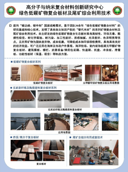 l 技术基础:基于团队30余年在高分子复合材料与纳米材料领域的研究基础及“绿色低碳矿物复合材料”系列核心技术,属于原始创新、自主知识产权,在生物医药大健康、镁锌能源、电池隔膜、海洋工程等领域的高分子及纳米复合材料研究及应用技术均处于国内外先进水平,已授权近百项美国、加拿大等国际发明专利和中国发明专利。
