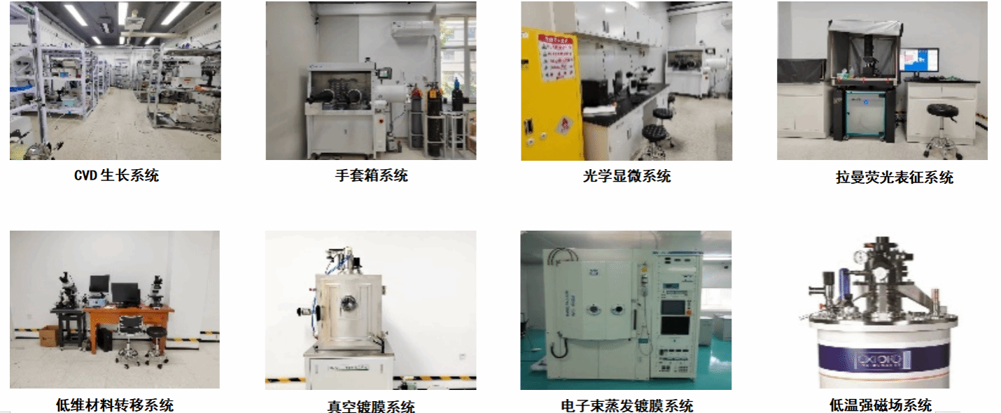 本实验设备涵盖材料生长制备,器件微纳加工,光学表征和极低温输运测量几个方面。主要设备
