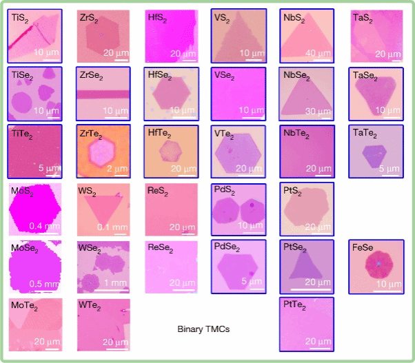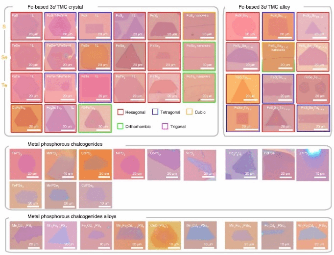 2. 提出了一种基于竞争化学反应的生长机理,并实现了67种确定相、可控结构和可调组分的二维硫族及磷硫化合物。