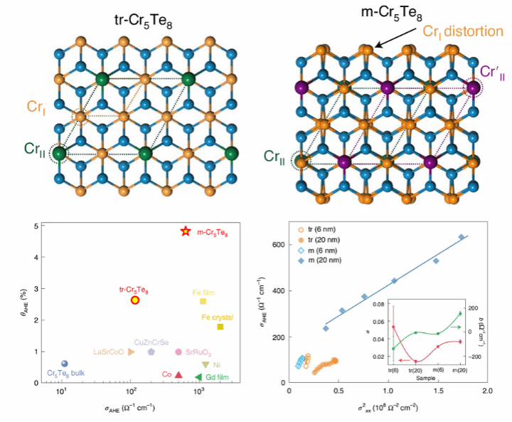 2. 实现了稳定的磁性材料Cr5Te8的制备与相的调控,并观察到大的反常霍尔角与反常霍尔电导率。