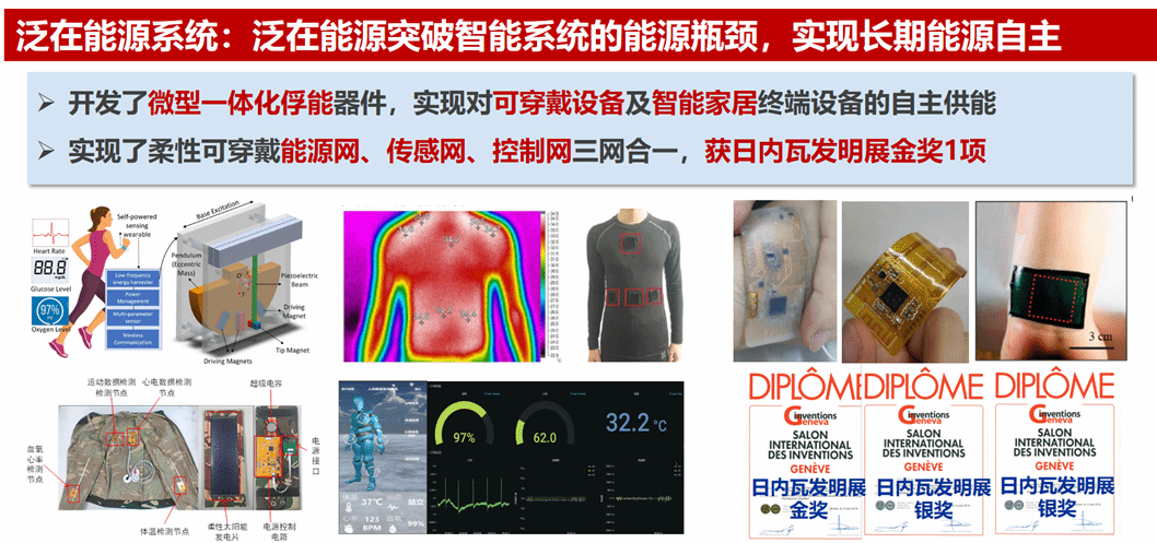团队已获国家自然科学二等奖1项,国家科技进步二等奖2项等。以机械能发电、温差发电和太阳能发电等泛在能源俘获与控制技术研究为基础,研究能感合一、多场耦合机理,多能合一综合俘能控制,搭建智能可穿戴泛在系统,获日内瓦国际发明展金奖1项,银奖2项等。