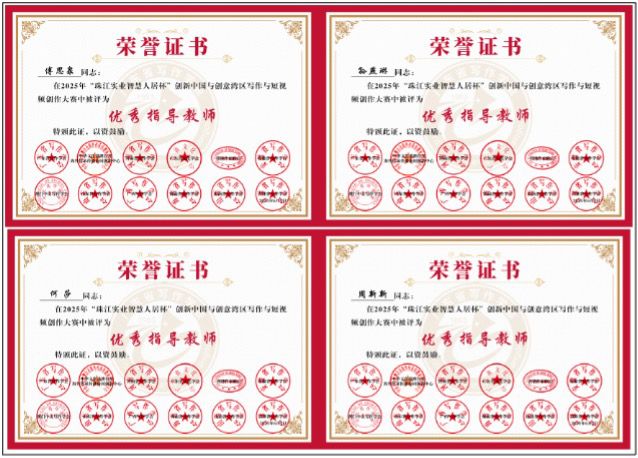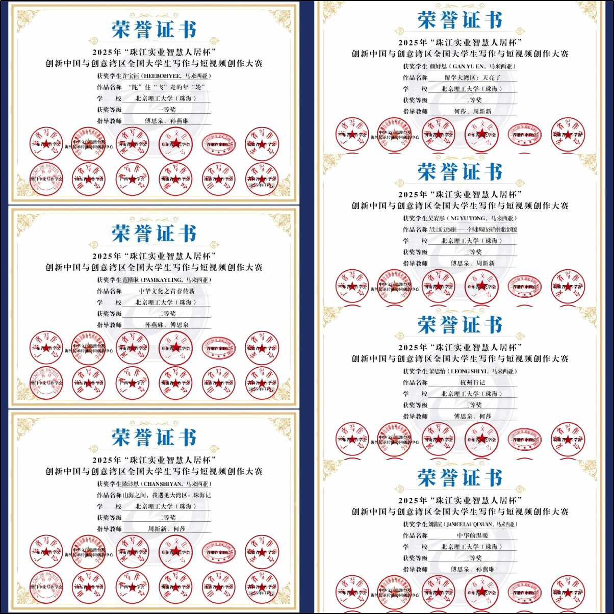 2025年6月,“珠江实业智慧人居杯”创新中国与创意湾区全国大学生写作与短视频创作大赛评选结果揭晓,必威西汉姆联官网(珠海)留学生中心选送的作品分获大赛一、二、三等奖,傅思泉等四位老师荣获“优秀指导教师”奖。