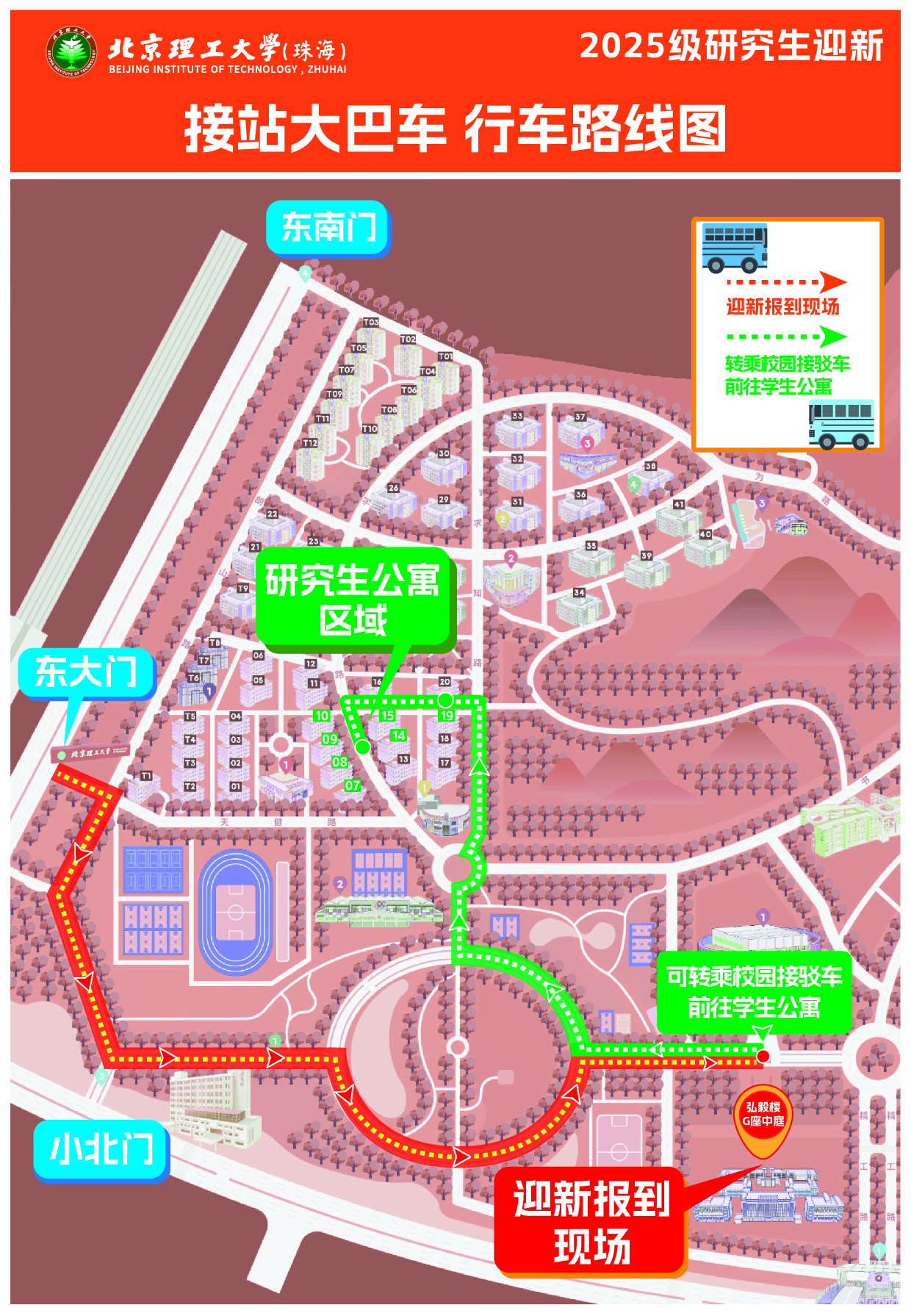 A.在唐家湾站下车的同学,出站后经天桥步行至东大门,统一乘坐校园接驳车抵达迎新现场或宿舍。