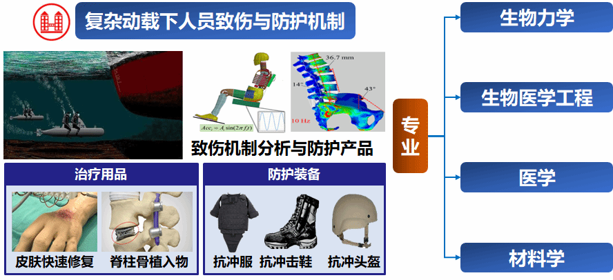 针对海洋极端环境下人员安全,攻克爆炸/冲击/振动致伤机制、非线性应力波调控、微结构逆向设计等基础性科学问题与关键技术难题,研制新型止血材料、新型治疗装置与方案、人员防护装备等产品,突破人员的“伤、防、治”难题,承担国家重大科研项目。