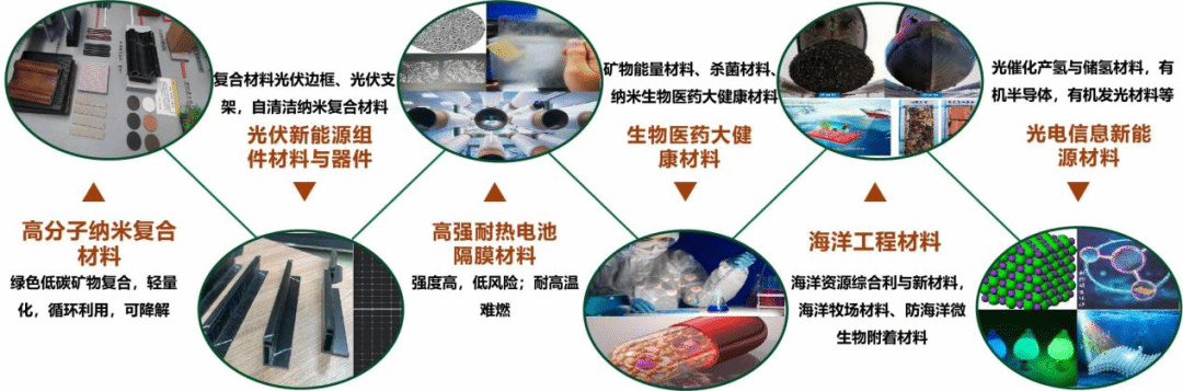包括矿物复合能量大健康材料、杀菌材料、纳米酶生物医药材料、海洋微生物大健康材料、胶原蛋白和凝胶医美材料等。