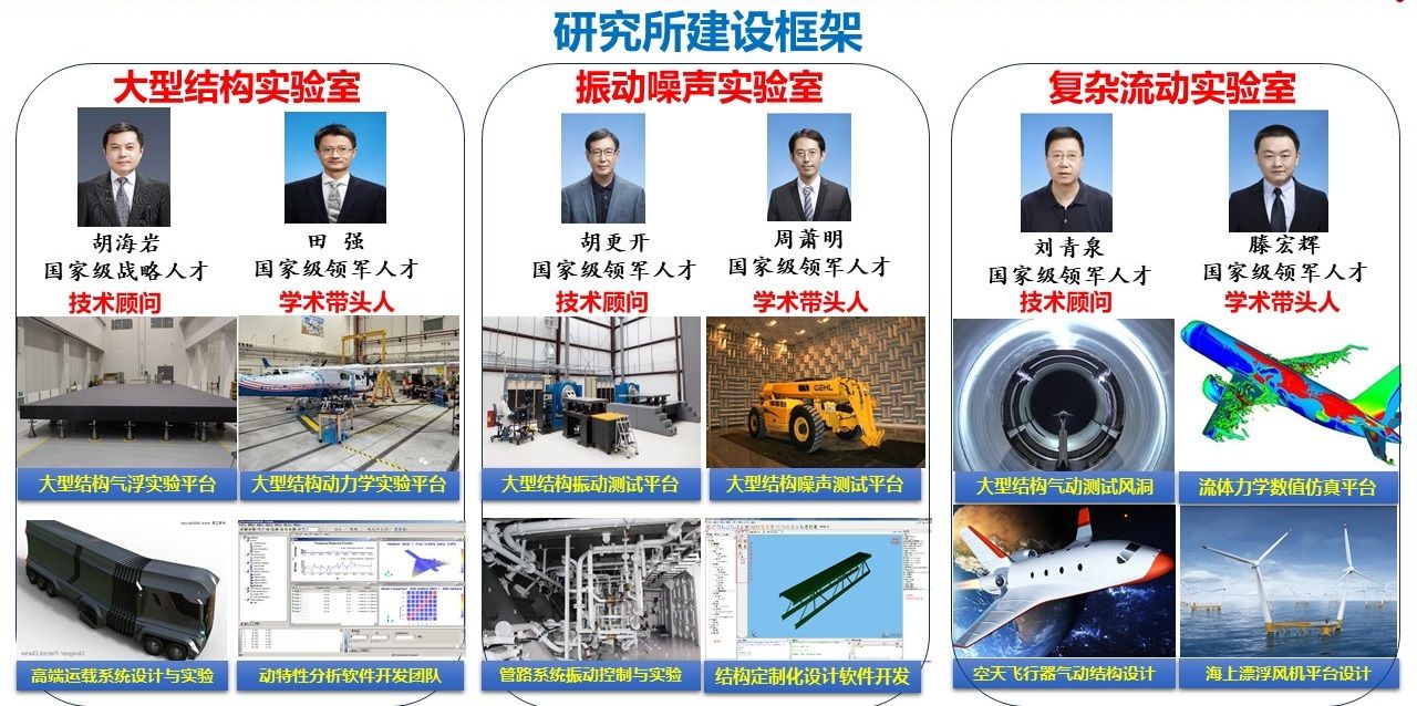 研究所紧密围绕大湾区低空经济、海洋风电、汽车制造、航空航天等产业领域中大型结构动特性设计、减振降噪、复杂流场感知与控制等关键核心技术攻关需求,拟设立三大实验室:大型结构实验室、振动噪声实验室、复杂流动实验室。