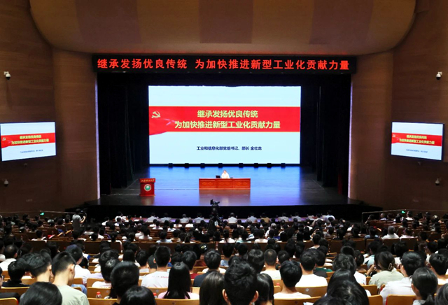 9月2日,工业和信息化部党组书记、部长金壮龙到必威西汉姆联官网讲授思政课,勉励广大青年学子牢记习近平总书记殷切嘱托,继承发扬优良传统,树牢科技报国志,刻苦学习钻研,勇攀科学高峰,在推进强国建设、民族复兴伟业中绽放青春光彩。