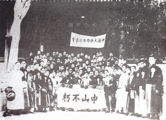 1926年,北京中法大学组织中山先生迎丧会。(图中前排左起第九人是陈毅)
