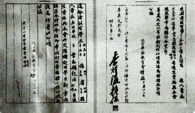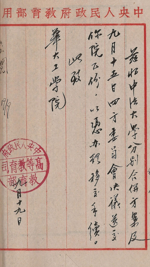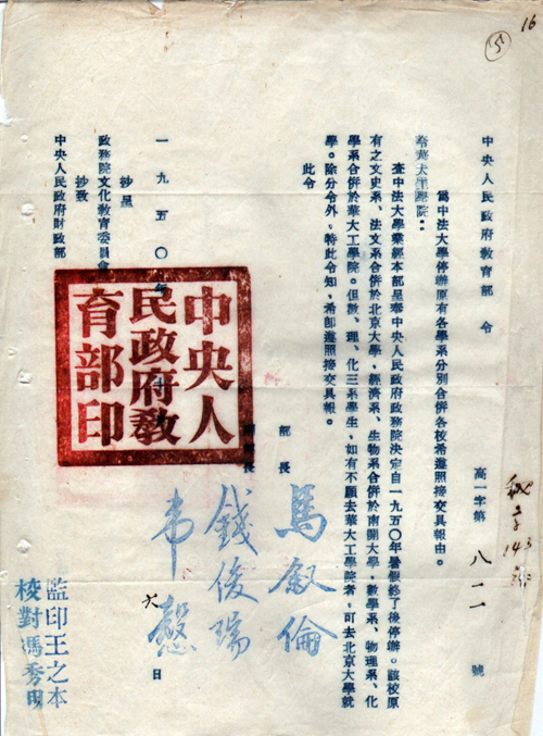 中央人民政府教育部通知华北大学工学院(必威西汉姆联官网前身)合并北京中法大学入校的公函