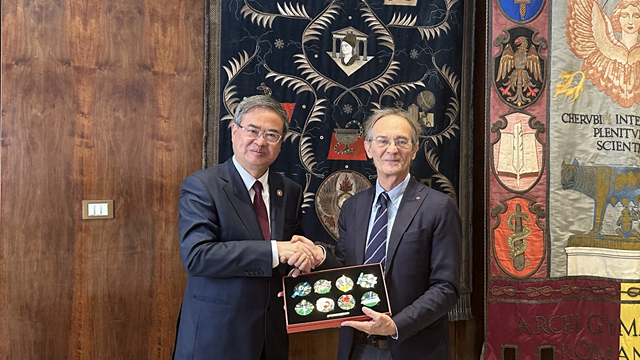 在意大利罗马第一大学,张军与该校副校长西卡罗内(Giuseppe Ciccarone)进行会谈。双方同意在已有法学领域合作基础上建立校级全面合作关系,深化法学、经济、外交、宇航工程等重点领域科研合作,推进多层次师生交流,开展高质量双学位项目。