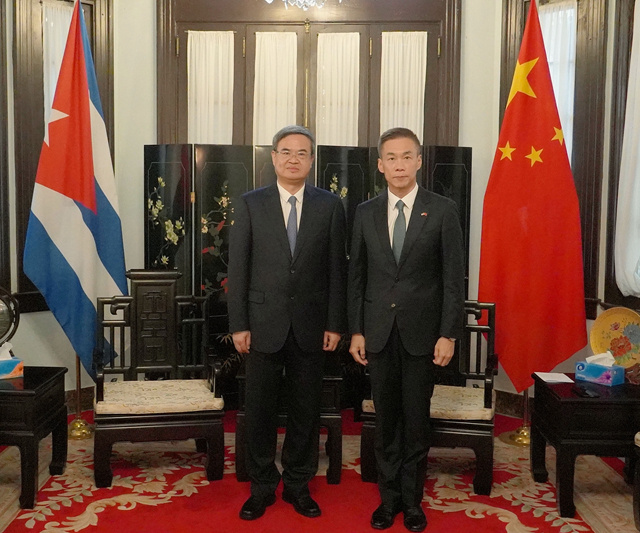 在中国驻古巴大使馆,张军与华昕大使围绕两国关系、科技合作等议题做深入交流讨论,华昕赞赏我校与古巴科研机构以及高校开展的合作,他表示,使馆将全力支持北理工与古巴各界开展高质量学术和科技合作。