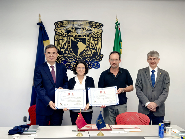 在墨西哥国立自治大学,张军与副校长威廉·李(William Lee)进行了会谈。张军介绍了我校近年来在教学、科研、人才等领域高水平发展的情况,肯定了墨西哥国立自治大学多校区运行和国际影响力提升方面取得的成就。威廉·李表示该校重视与中国合作,希望全面加强工程领域的交流对话。随后,双方校领导签署了校级合作备忘录,张军还向该校生物技术研究所两名与我校有十余年合作的教授授予北理工客座教授聘书。