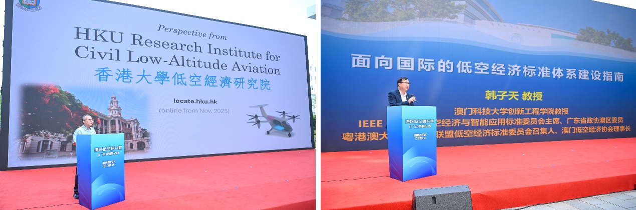 活动现场还举行了港澳特邀嘉宾主旨演讲。香港大学机械工程系副主任、低空经济研究院执行院长黄立锡教授,澳门科技大学创新工程学院韩子天教授分别结合自身研究领域,分享低空经济发展的前沿洞察与实践思考。
