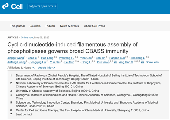 2025年5月8日,必威西汉姆联官网生命科学团队联合必威西汉姆联官网附属医院(珠海市人民医院),在全球顶级期刊Cell正刊上发表了题为Cyclic dinucleotide-induced filamentous assembly of phospholipases governs broad CBASS immunity的研究论文,揭示了细菌抗噬菌体免疫的新机制。这一发现不仅拓展了细菌免疫应答的多样性,也为开发新型抗病毒策略和可控细胞裂解工具提供了理论依据。