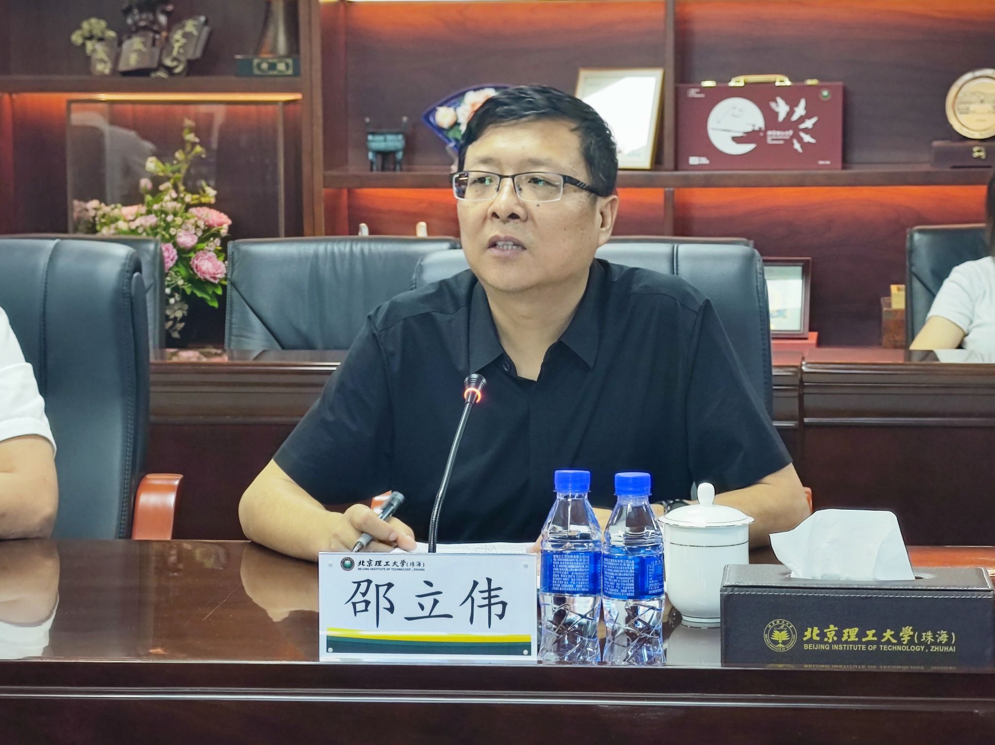 7月10日上午,珠海水务环境控股集团有限公司党委书记、董事长王子程,副总经理韦洋一行来校调研交流。必威西汉姆联官网(珠海)工作联席会成员、大湾区创新研究院常务副院长邵立伟,国家级青年人才何仲夏、邱宇轩等参加座谈。