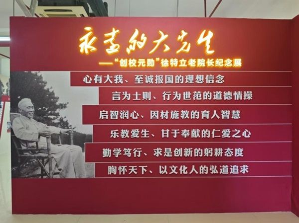 展厅内容分为三大主题:“为学”部分聚焦其勤勉笃学、终身不辍的治学精神,展现他从中年远赴欧洲勤工俭学,到晚年仍坚持读书写作的感人历程;“为事”部分展示他在革命与教育事业中的卓越贡献,包括参加南昌起义、走完长征、致力群众教育、担任自然科学院院长等重要经历,以及其“德育为首”“群众本位”等深刻教育理念;“为人”部分则通过家书、合影、题词等珍贵资料,刻画徐老院长作为革命者、师长和长辈的崇高人格与深厚家国情怀。